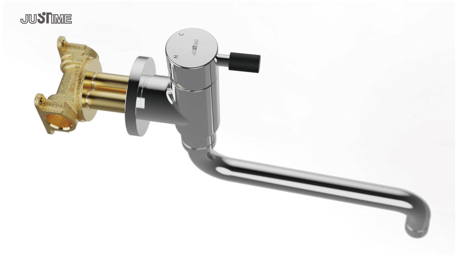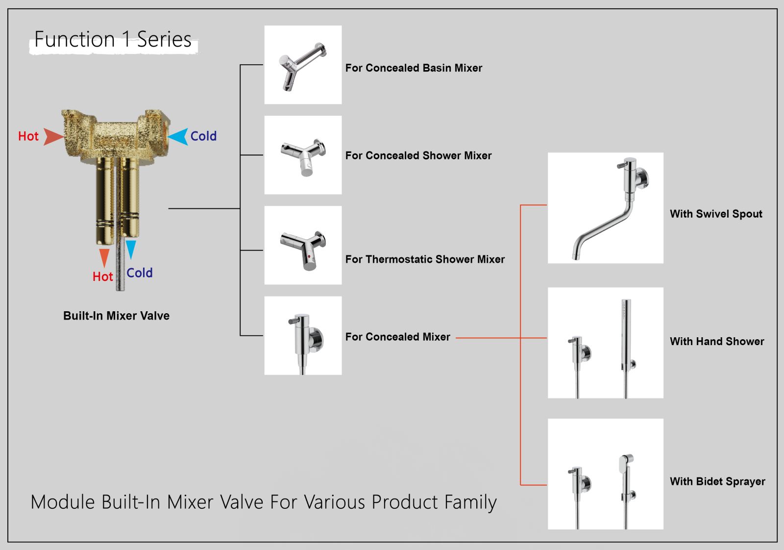 場域通用方面,模組化的J系列埋壁水路搭配逆止閥使模組成為水管的一部分,可以共用任何巧時代衛浴的J系列埋壁式混溫閥龍頭;其次,Function 1 龍頭本體不同場域間的用水皆可以此延伸,以同一款龍頭本體為發展,搭配出水管、花灑與洗滌器等不同配件,發展成不同功能的產品,適用於面盆、淋浴、臀洗、廚房等各種使用場合。